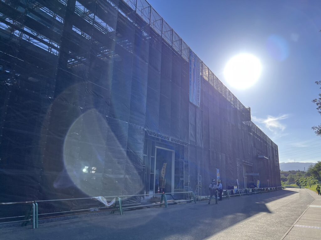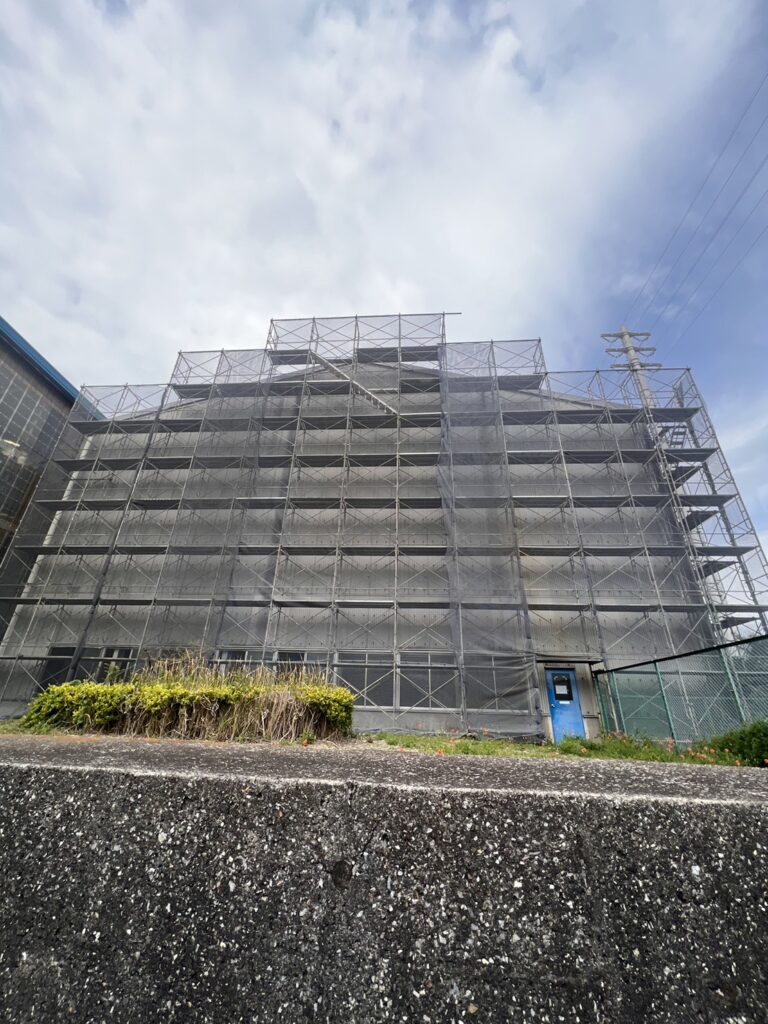 お疲れ様です。前回、紹介した足場の完成状況になります。風が強いのと壁の状態により、足場が普段より弱いのでシートではなく垂直ネットを貼りました。又、妻側の足場はひな壇になっているため、屋根の合唱部分が足