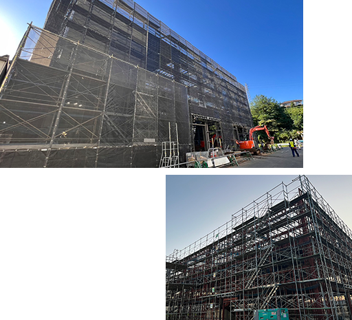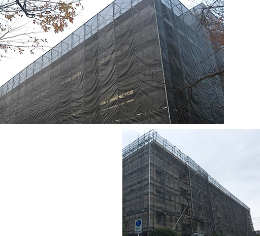 一般的に改修工事は、新築工事よりも短工期のため、組立て・解体・撤収を迅速に行える、くさび式足場・単管足場を組むことが多いです。